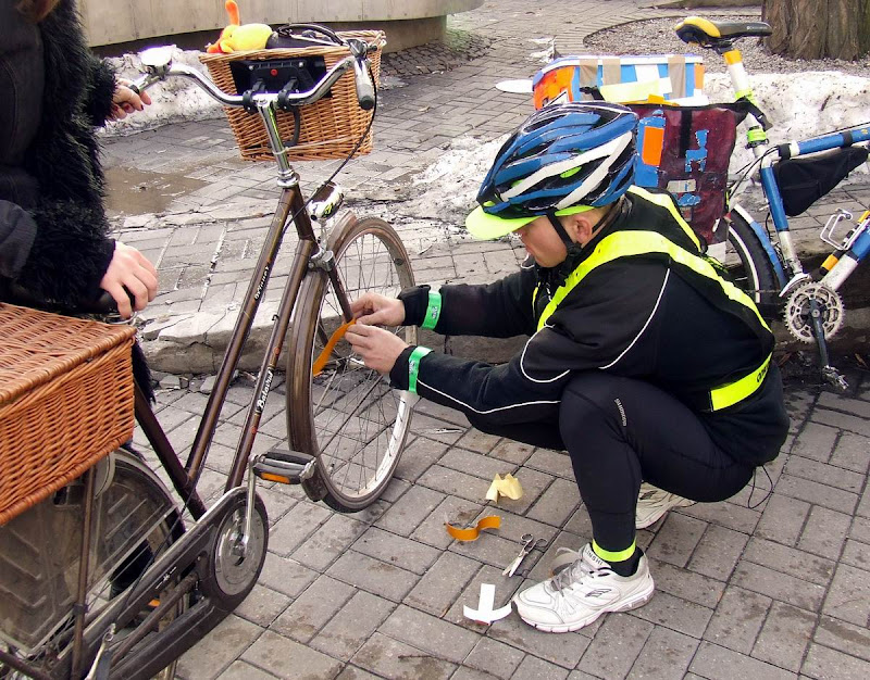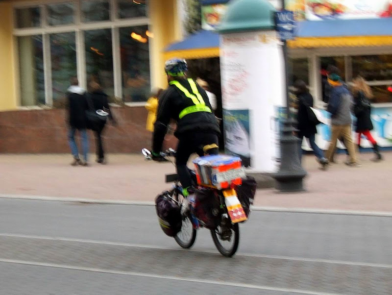 Mimo, że nie spał już z 48 godzin (ostatniej nocy przyjechał do Łodzi rowerem z Elbląga), zatrzymywał dziś na Piotrkowskiej cyklistów i oklejał im rowery odblaskowymi naklejkami.