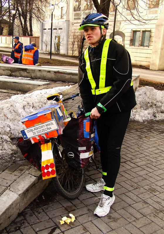 Anioł na imię ma Maciek i od około roku jeździ po całym kraju na rowerze rozdając odblaski. Kiedyś był świadkiem śmiertelnego wypadku na przejściu dla pieszych i podróżując po Polsce chce zadbać, żeby piesi i rowerzyści byli widoczni i bezpieczni.